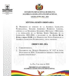 “El presidente en ejercicio de la Asamblea Legislativa Plurinacional, senador Andrónico Rodríguez Ledezma, convoca a las senadoras y senadores, diputadas y diputados, a la instalación de la séptima sesión ordinaria de la legislatura 2023 – 2024”, reseña el comunicado.