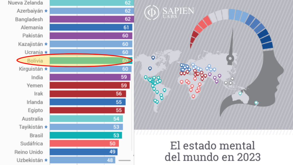 El informe señala que, en una escala de 0 a 100, Bolivia obtuvo 60 puntos en bienestar mental, mientras que Brasil alcanzó los 53 puntos. En contraste, los países mejor posicionados en la región son Perú y Colombia, con 77 puntos cada uno.