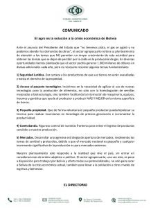 Nuestro planteamiento solo responde a la realidad que vive el país, sin entrar en consideraciones de orden subjetivo o político. El sector agropecuario, una vez más, se pone a disposición para trabajar por Bolivia y oferta todas sus potencialidades, no solo para sacar a Bolivia de la crisis económica actual, también para llevar a la población a otros niveles de ingresos y bienestar.