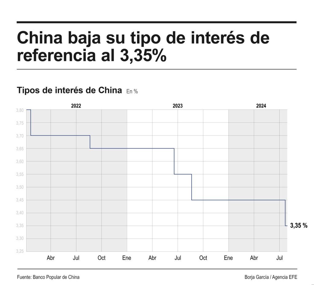Shanghái (China), 22 jul (EFE).- El Banco Popular de China (BPC, banco central) anunció hoy una inesperada rebaja de diez puntos básicos a su tipo de interés de referencia, denominada LPR a un año, que pasará del 3,45 %, nivel en el que se había mantenido desde agosto del año pasado, al 3,35 %.