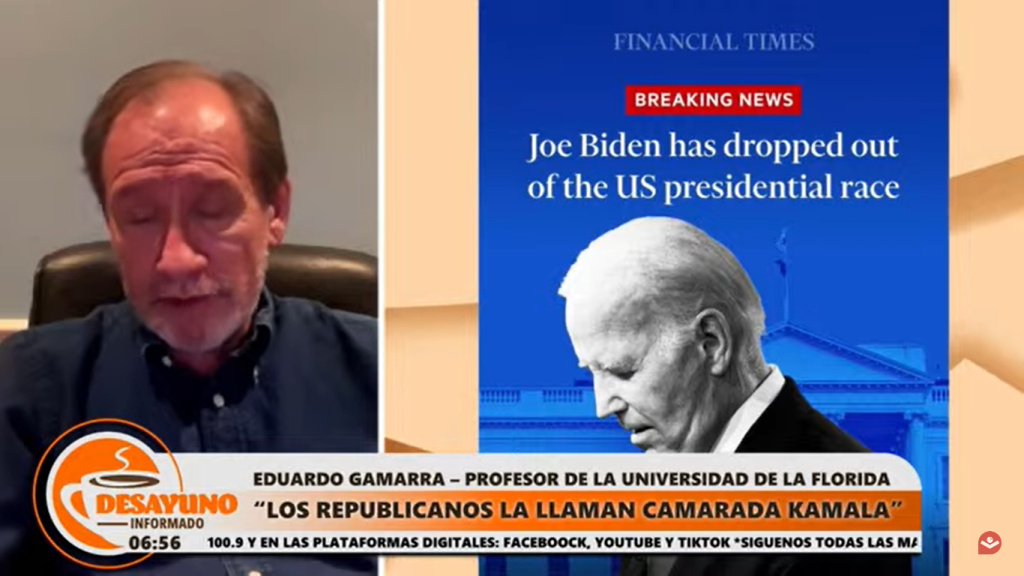 El profesor de la Universidad Internacional de La Florida, Eduardo Gamarra, asegura que la renuncia de Joe Biden a la candidatura presidencial y el ingreso de Kamala Harris como postulante del Partido Demócrata modifica radicalmente la campaña antes de las Elecciones del martes 5 de noviembre.