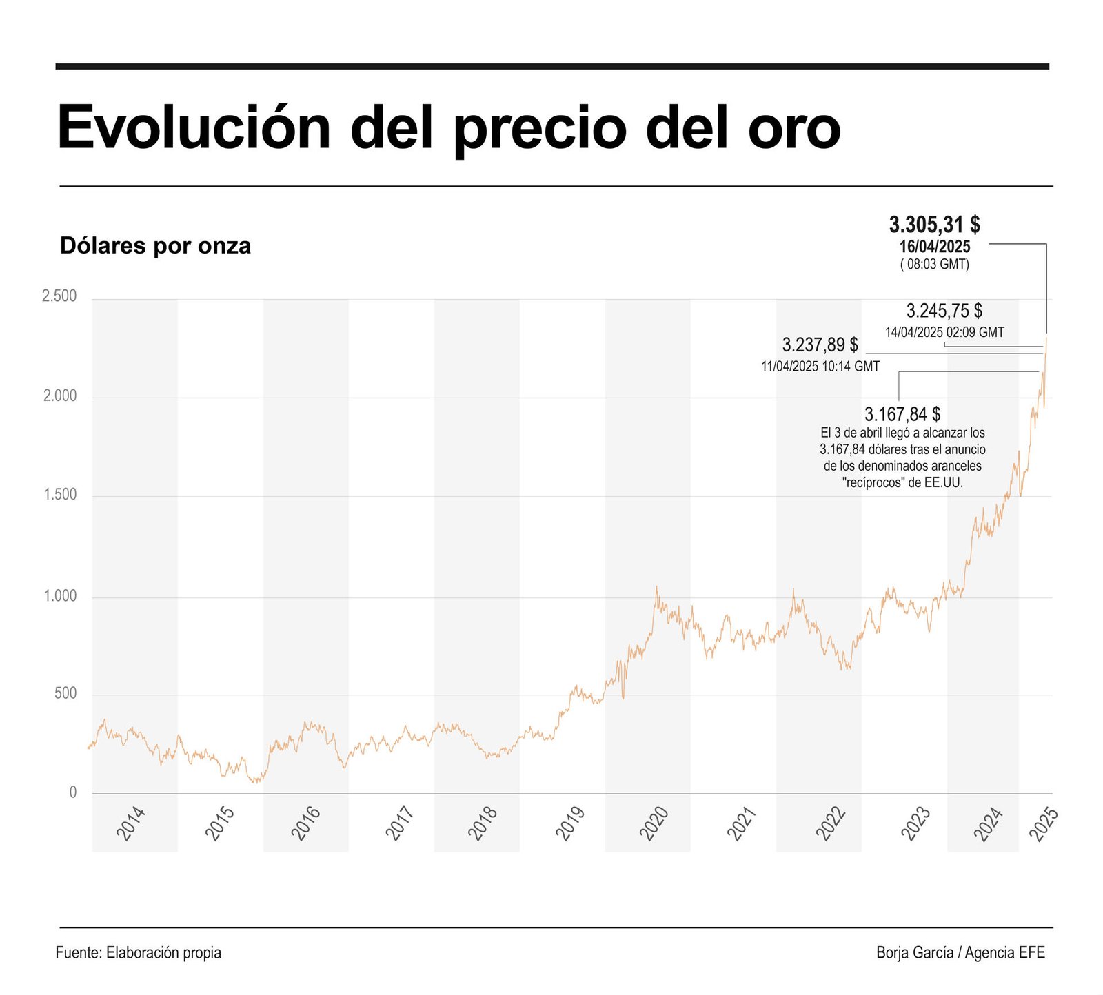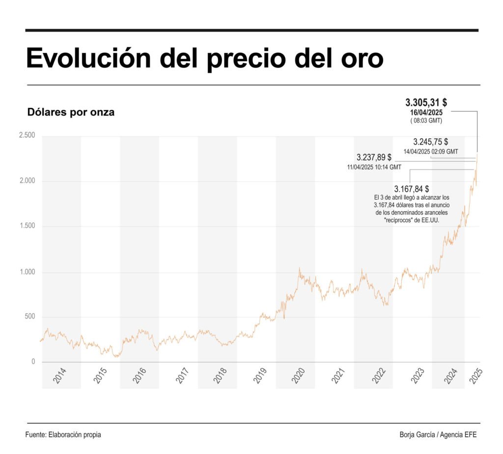 El oro ha ido registrando precios récord durante toda la sesión y a las 10 horas (8 GMT) superaba los 3.300 dólares, aupado por la debilidad del dólar.