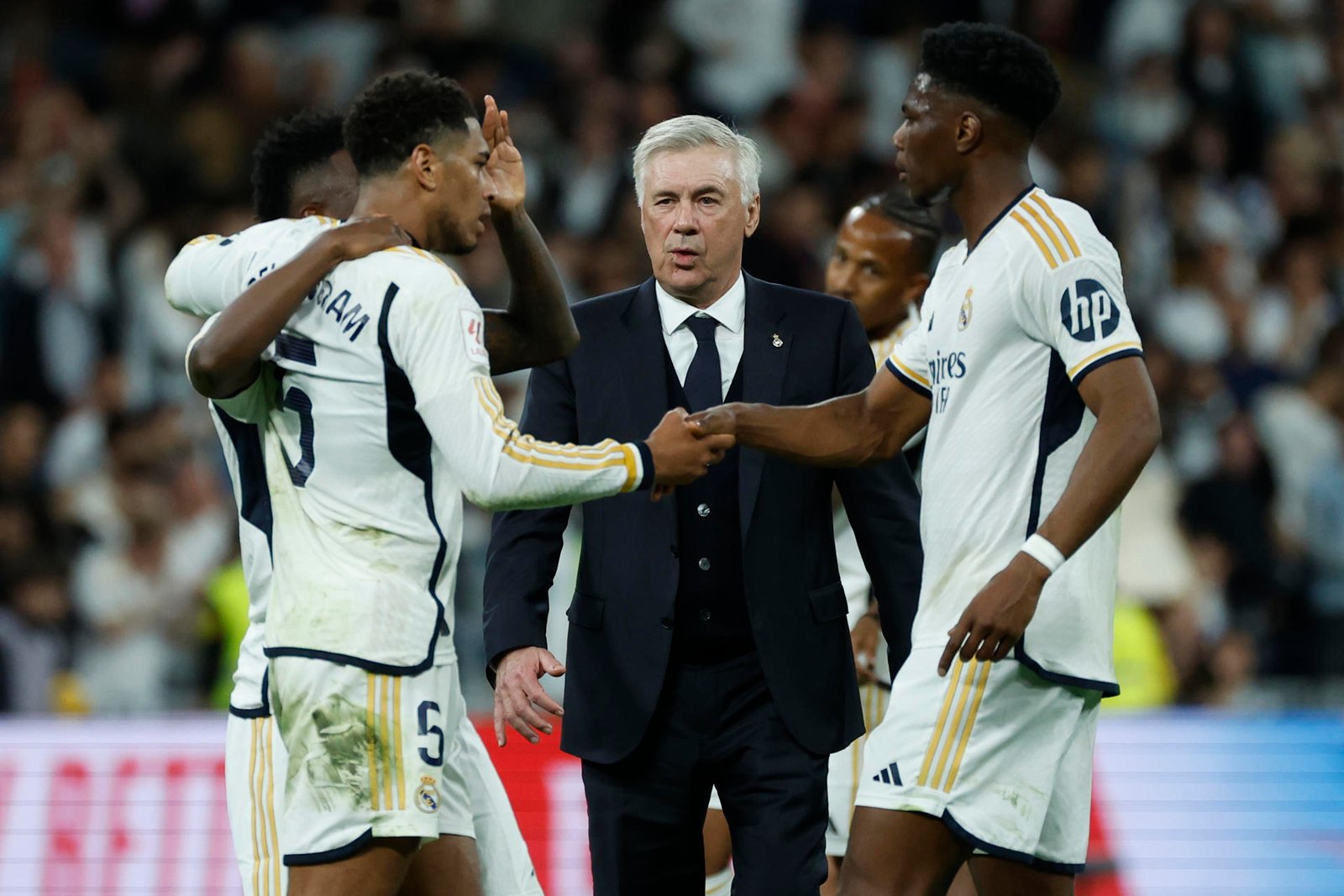 Los jugadores del Real Madrid y el entrenador Carlo Ancelotti (c) celebran la victoria del equipo tras el partido de la jornada 32 de LaLiga EA Sports entre Real Madrid y FC Barcelona, disputado este domingo en el estadio Santiago Bernabéu de Madrid. EFE/Juanjo Martín