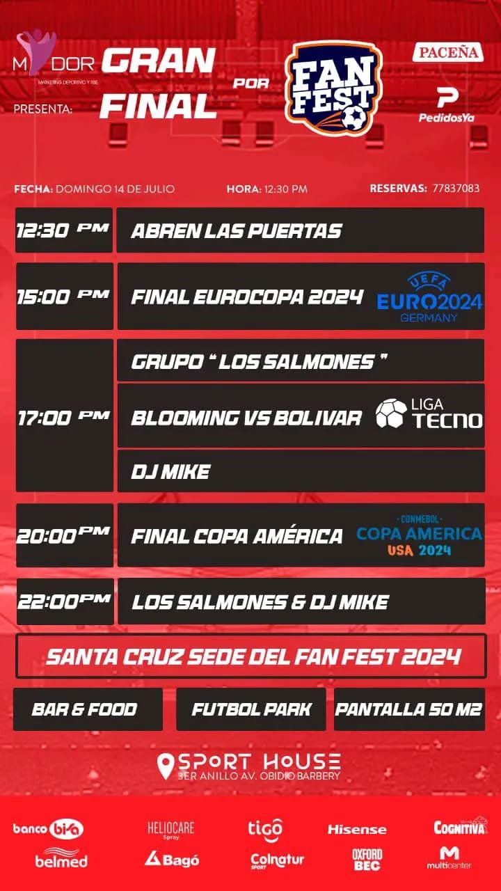 Este evento, abierto al público, se desarrollará en “Sport House”, ubicado en el 3er anillo Av. Ovidio Barbery, a partir de las 12:30 p.m. Las finales de la Eurocopa y Copa América, que se desarrollarán el mismo día, son algunos de los eventos deportivos más esperados y con mayor cantidad de espectadores en el mundo. Se espera una asistencia de cientos de personas, aunque hay cupos limitados.