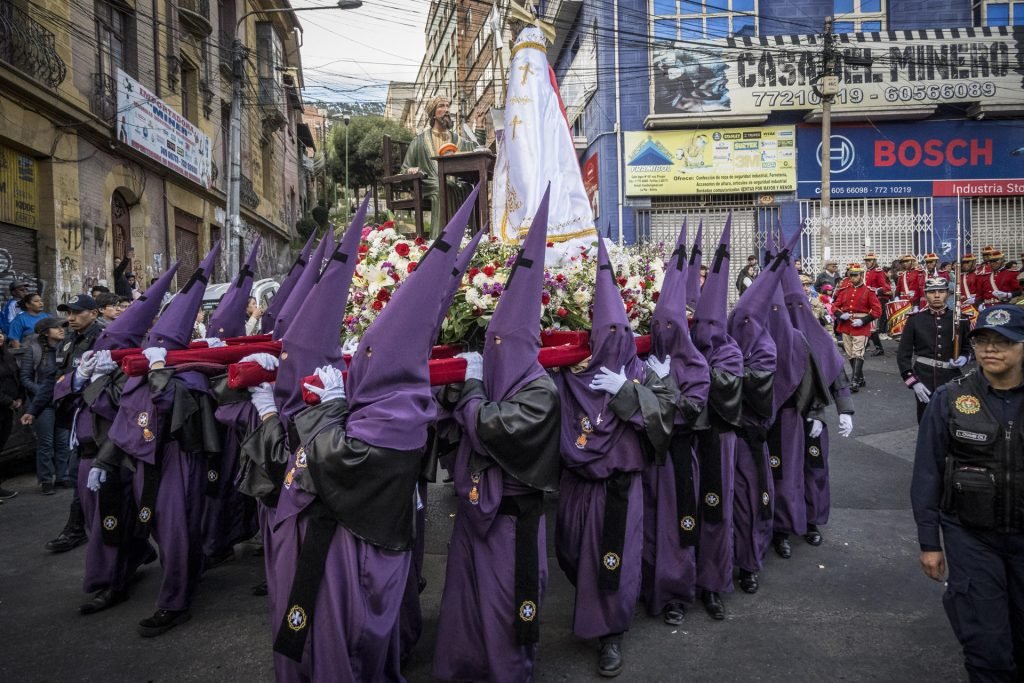 La procesión del Santo Sepulcro, que es tradicional en este Viernes Santo en Bolivia, volvió a su ruta histórica al igual que las bandas militares acompañaron el recorrido de los creyentes y también hubo recreaciones del viacrucis para celebrar la Semana Santa en La Paz.