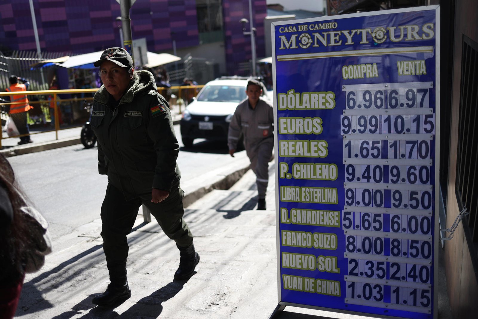 Fotografía de un letrero de una casa de cambios, este 1 de julio de 2024, en La Paz (Bolivia). EFE/ Luis Gandarillas