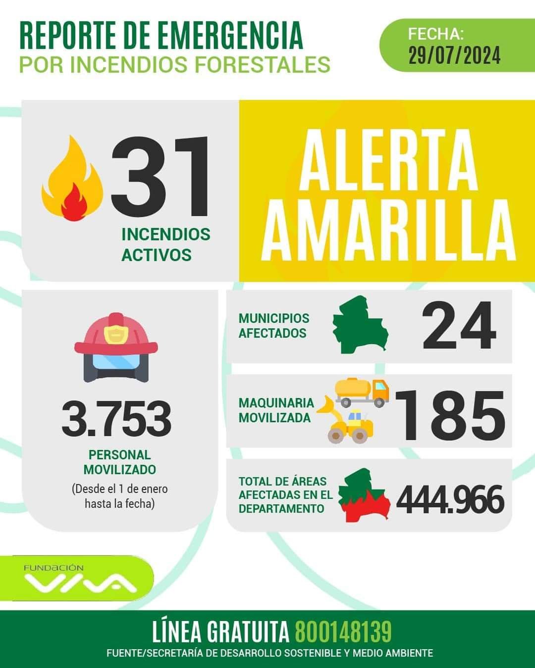 El Gobierno Autónomo Departamental de Santa Cruz, a través de Sistema de Alerta Temprana de Incendios Forestales (Satif), registra en esta jornada, 31 incendios en 14 municipios del departamento y 9.202 focos de calor.