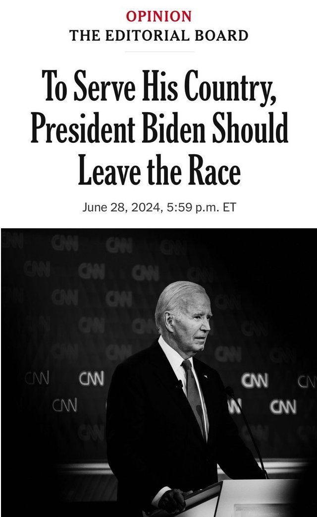 “Pedir un nuevo candidato demócrata a estas alturas de la campaña es una decisión que no se toma a la ligera, pero refleja la magnitud y la gravedad del desafío de Trump (…) la incapacidad de Biden para hacerle frente”, sentencia el editorial del medio presidido por Meredith Kopit Levien.