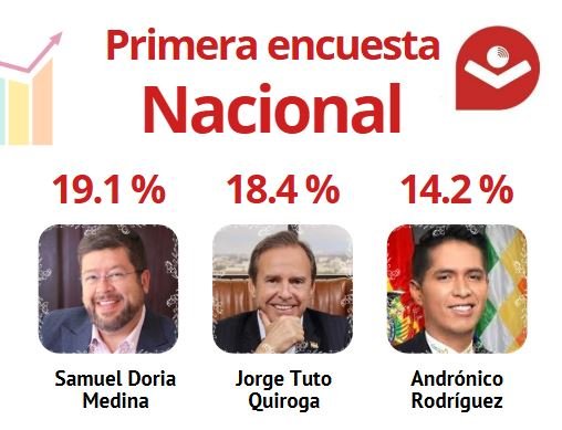 La primera encuesta nacional de intención de voto realizada por Ipsos CIESMORI, a 77 días de las elecciones generales del 17 de agosto, muestra una contienda muy reñida entre tres candidatos, que dominan en ocho de los nueve departamentos del país. Según la primera encuesta nacional de intención de voto realizada por Ipsos CIESMORI, Samuel Doria Medina (Unidad), Jorge Tuto Quiroga (Libre) y Andrónico Rodríguez (Alianza Popular) concentran la preferencia electoral, aunque ninguno de ellos alcanza el 20% a nivel nacional.