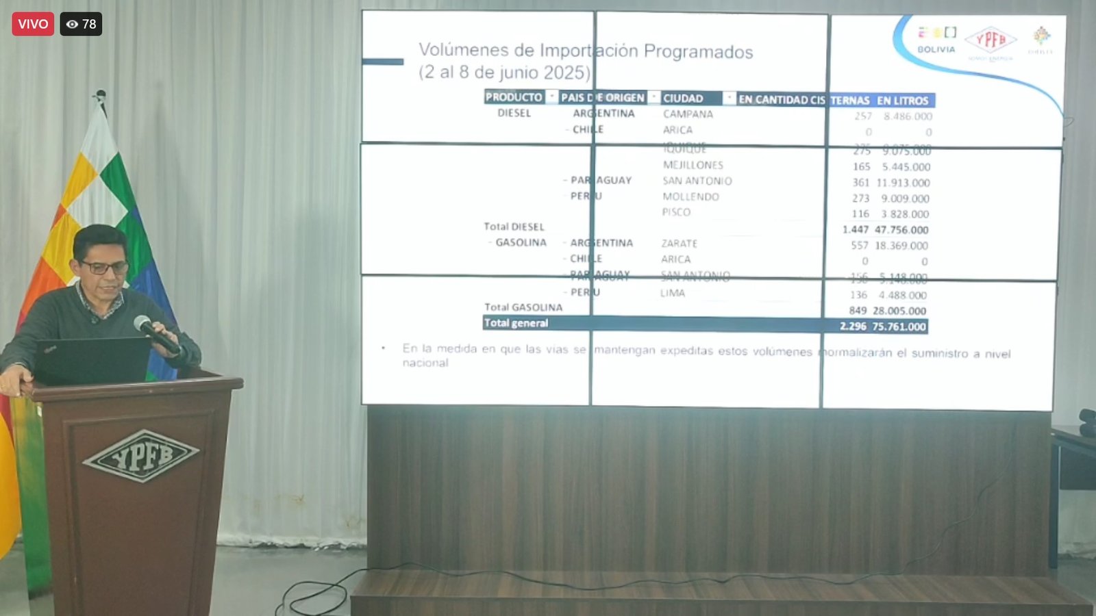 YPFB tiene previsto el arribo de 2.296 cisternas en total —1.447 con 47,7 millones de litros de diésel y 849 con 28 millones de gasolina—, siempre que las rutas se mantengan expeditas. “Estos volúmenes van a permitir tener una normalidad en función de la provisión a nivel nacional”, concluyó.